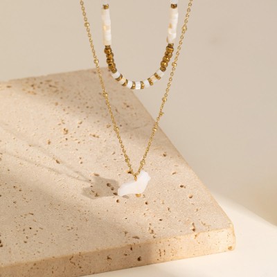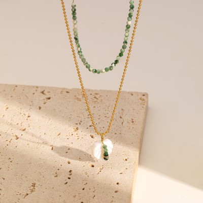 French Gold-Plated Stainless Steel Women's Necklace Double Beaded Shell Pendant Luxury Diamond-Encrusted Zircon Accessories