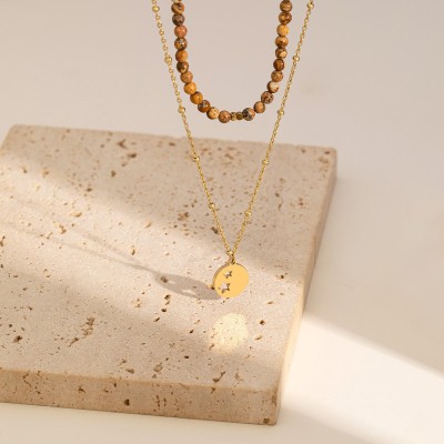 Stainless Steel Women's Necklace Fashion Personality Beaded Double Clavicle Chain Trend Hollowed Out Circular Pendant Vintage
